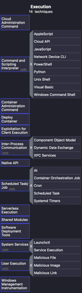 There are a plethora of ways an adversary can leverage the ATT&CK Execution (TA0002) array of techniques on a victim's environment. As we can see in the snapshot below, it is a pretty massive grouping of 14 techniques and the variety can seem overwhelming at first.