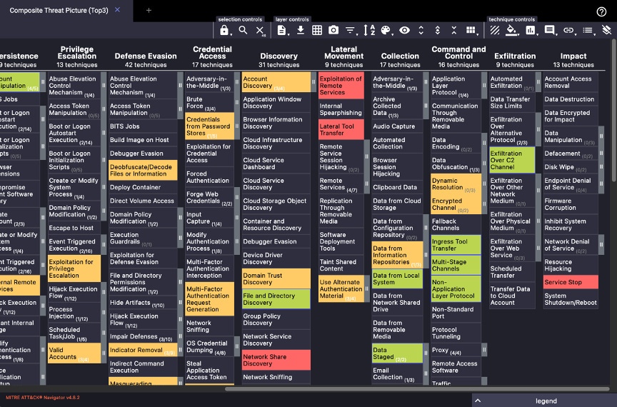 The process of conducting these gap analyses vary from organization to organization, but a great place to start is with MITRE’s own ATT&CK Navigator. You can self-host it for internal (and even air-gapped) use. I tend to stick with a publicly open and shared instance for training and demonstrations. A sample threat picture is shown below.