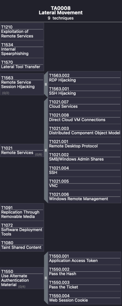 Lateral Movement (TA0008) is a group of techniques that an adversary deploys to gain access to and control any additional systems in the target environment. Attackers without Lateral Movement cannot hope to impact their victims. Traditional warfare would see the defenders quickly encircle the invaders and repel them more often. And for cyber warfare it is no different. Adversaries without must compromise any targets remotely, one at a time. This is noisy, cumbersome, and in many cases impossible.