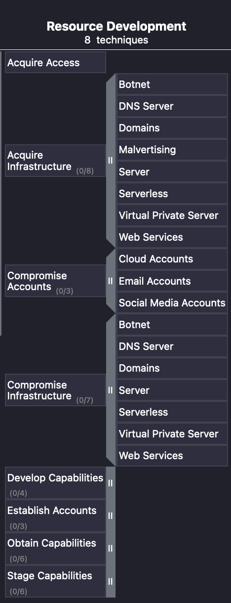 Threat actors can't just wish an attack into being. Much like the systems they target, they need infrastructure! They need resources to host the various portions of the attack. They very likely will need some applications, accounts, certificates and more just to carry out the simplest of capers. When an adversary needs to intercept your traffic, for instance, they have to have a means by which to direct traffic to systems they control and a place to store any gleaned information. Even a simple, spiteful Denial of Service requires coordination of assets to launch joint attacks. If we take a look at the techniques in this Tactic, it looks an awful lot like setting up a legitimate hybrid enterprise from scratch! Aside from the botnets. I have used a snapshot from Resource Development in ATT&CK Navigator rather than the Enterprise Matrix homepage because it renders a little more compactly: