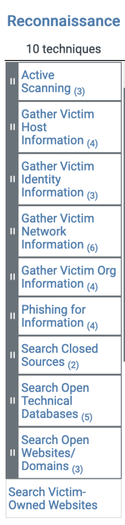 Let's switch back to adversaries in a cyber realm. As the first real stage of a campaign or attack, adversaries take this step to gather information they hope to use in refining their playbooks and adapting them to the future operations. It might sound boring, but these vital techniques are the homework that allow threat actors to effectively target their quarry, and they can't stop just because the recon phase is hard. This group includes both passive and active techniques to gather that information.