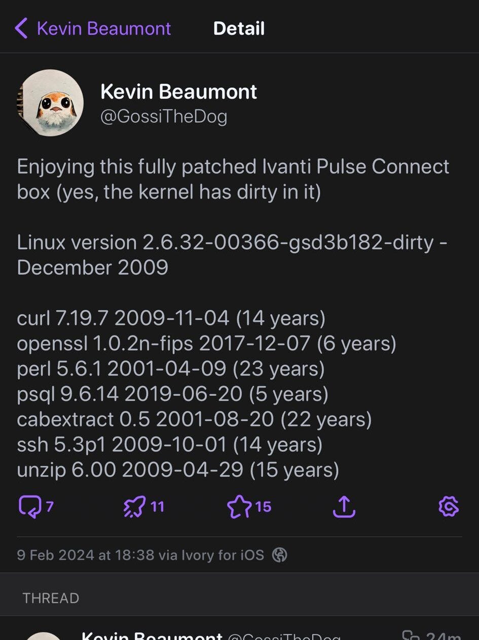 Defenders have it bad enough trying to improve the things they have control over. It seems only fair that they should expect their vendors to do the same. Especially when those are security tools we're talking about. All the compensating controls in the world are going to have a hard time with the issues in Ivanti Connect VPN. If you've been following my blog or anyone else who talks about threats and vulns, you probably have seen a lot of issues, US CERT directives, and even Executive Orders that have involved Ivanti. Well, Kevin Beaumont shows us why. In a box using the latest Ivanti image, he finds critical libraries that are old enough to drink and almost rent cars! C'mon folks! This is a 'security' solution?